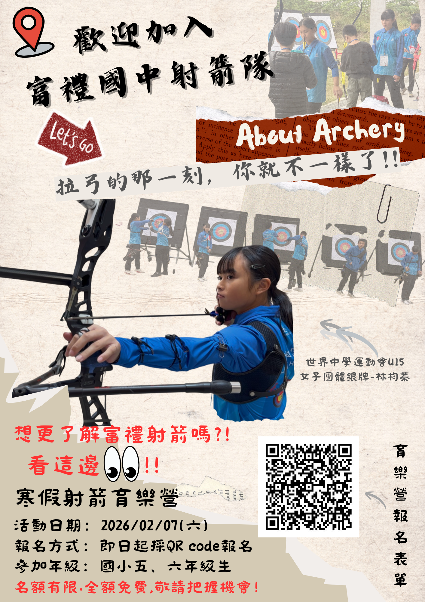 | 一、 | 富禮國中為推廣射箭運動及強化學生專注力與運動素養,本校特舉辦國小學生射箭體驗活動,詳細活動資訊如下: |