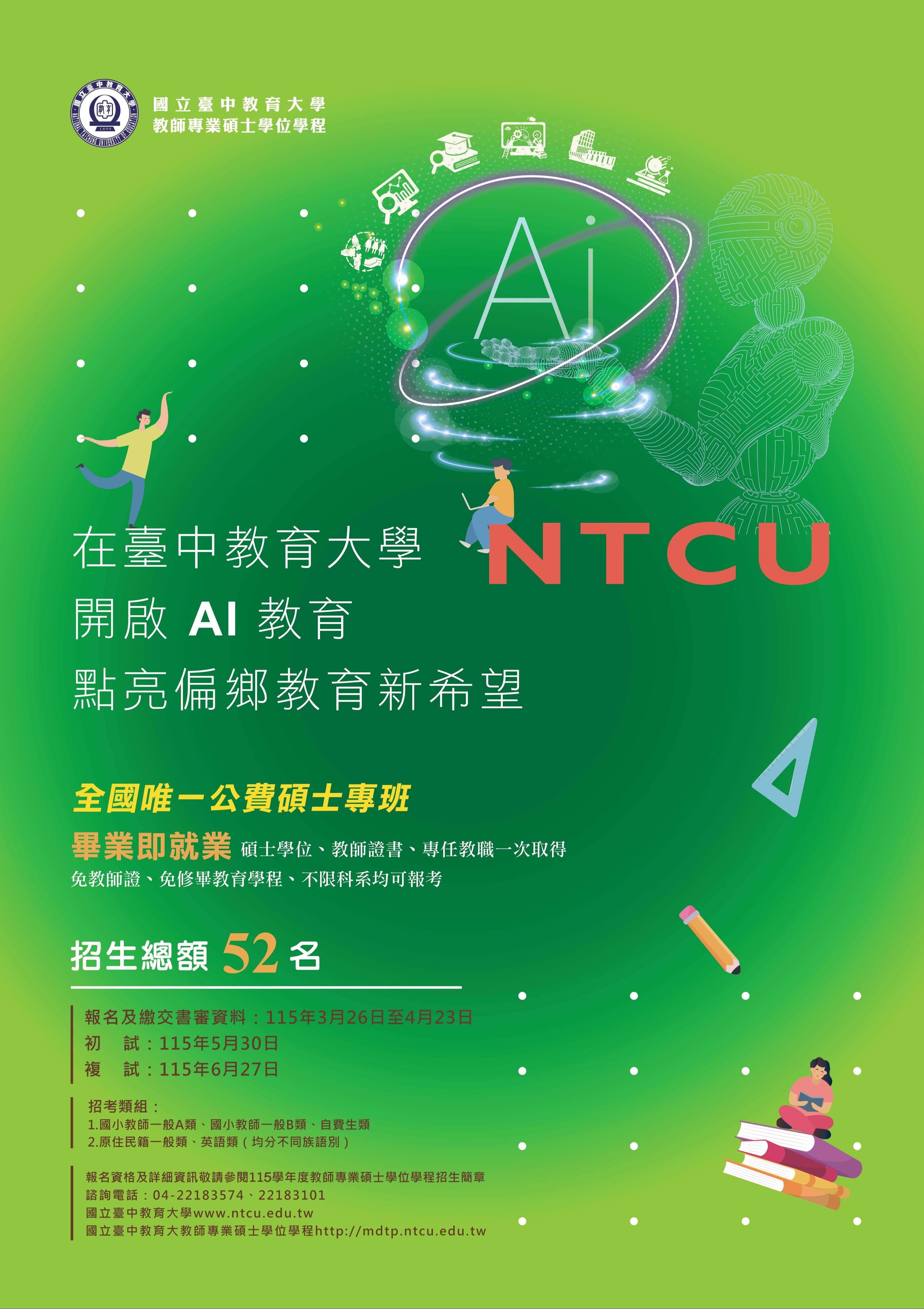 | 二、 | 115學年度招生考試自115年3月26日至4月23日報名(含繳交書審資料),5月30日初試,6月27日複試,招生簡章請參閱本校招生資訊網(https://as.ntcu.edu.tw/)。 |
