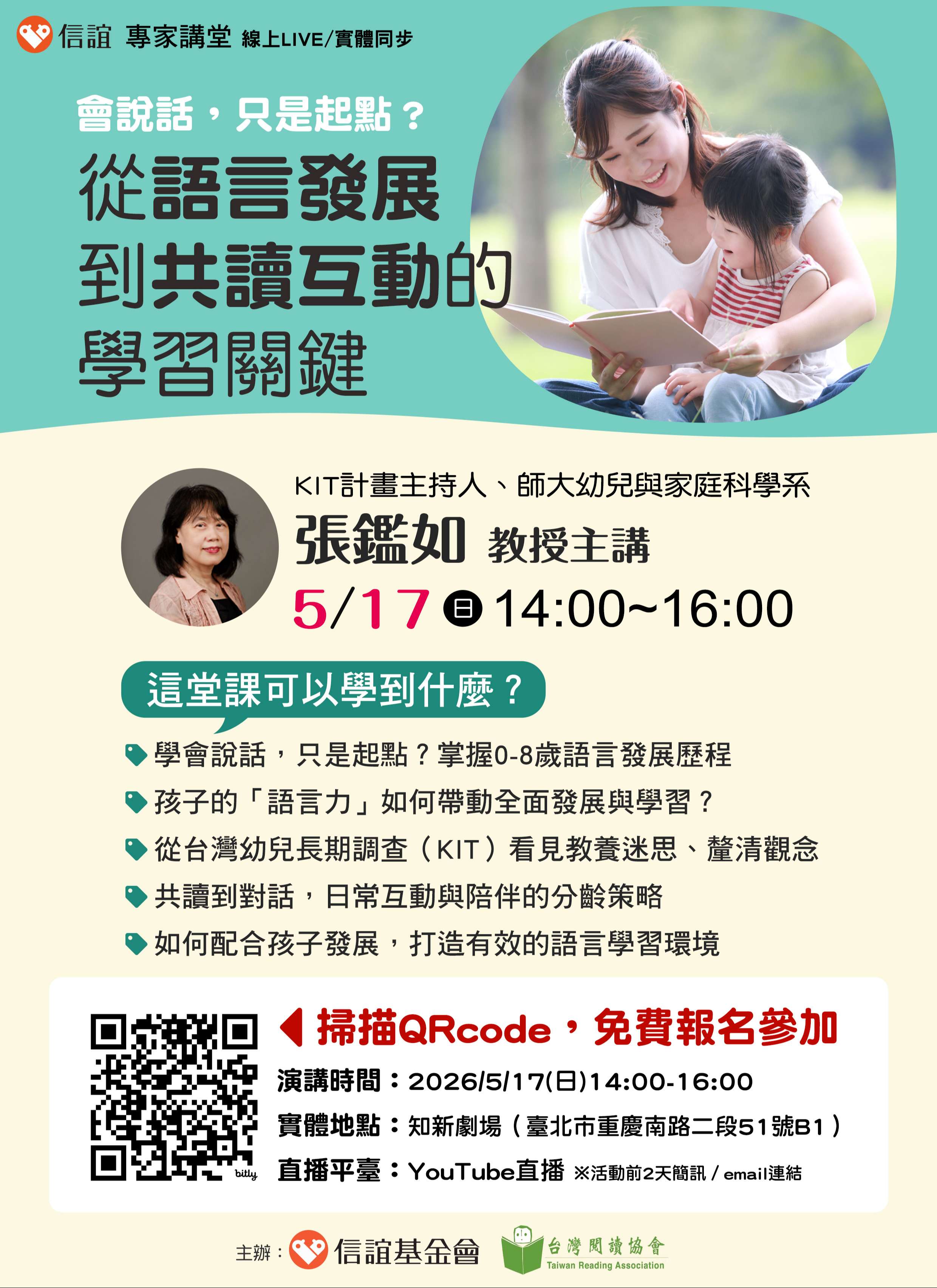一、語言發展好,學習表現真的會加分?講話卡卡,是哪裡出了問題?每天都有共讀,孩子還是沒進步…語言力不僅是對外溝通的工具,也是很重要的未來競爭力!信誼將於2026年5月17日(日)下午2:00-4:00舉辦【會說話,只是起點?從語言發展到共讀互動的學習關鍵】講座,採線上LIVE與實體課程同步,邀請0-8歲孩子家長免費報名參加。